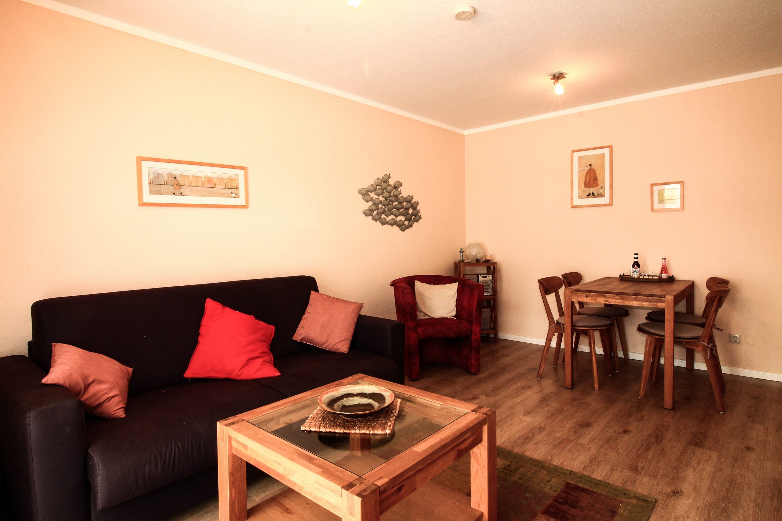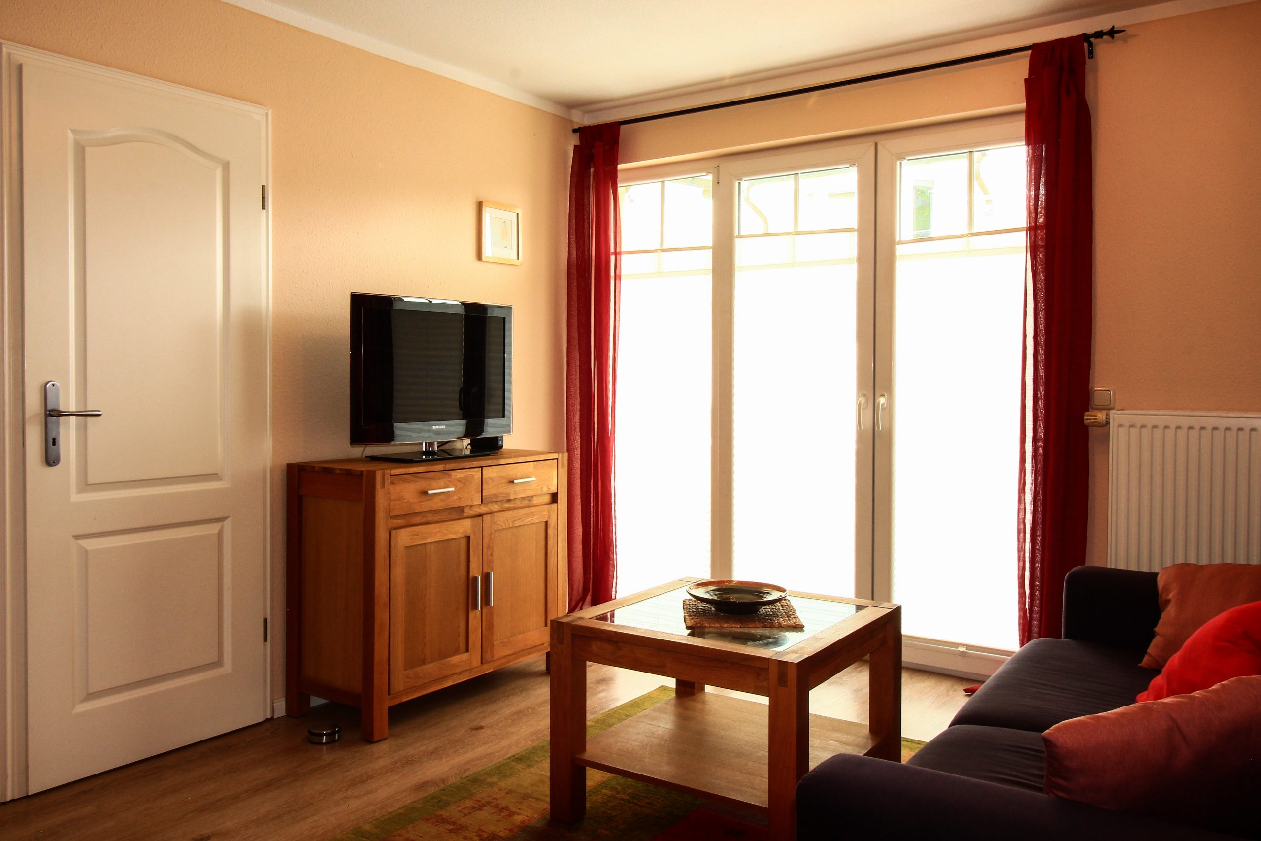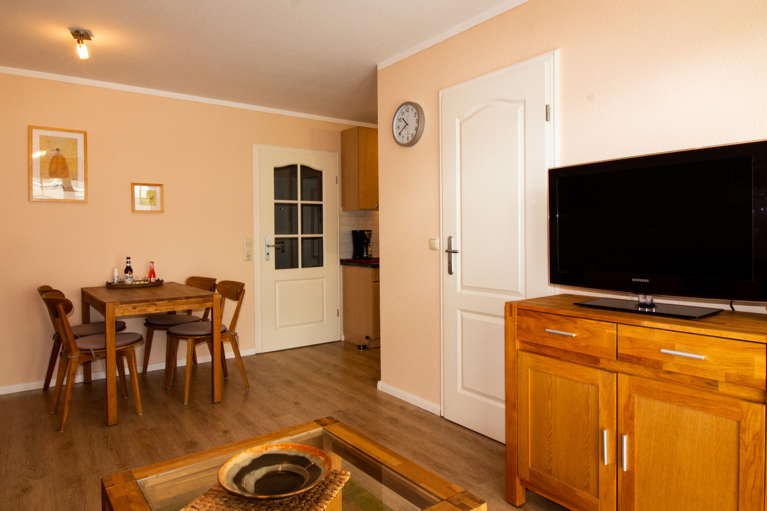 Das Wohnzimmer ist mit einem Sofa, Sessel, kleinem Tisch sowie einem Esstisch mit 4 Stühlen ausgestattet. Es gibt einen Fernseher, eine kleine Musikanlage sowie einen DVD-Player.