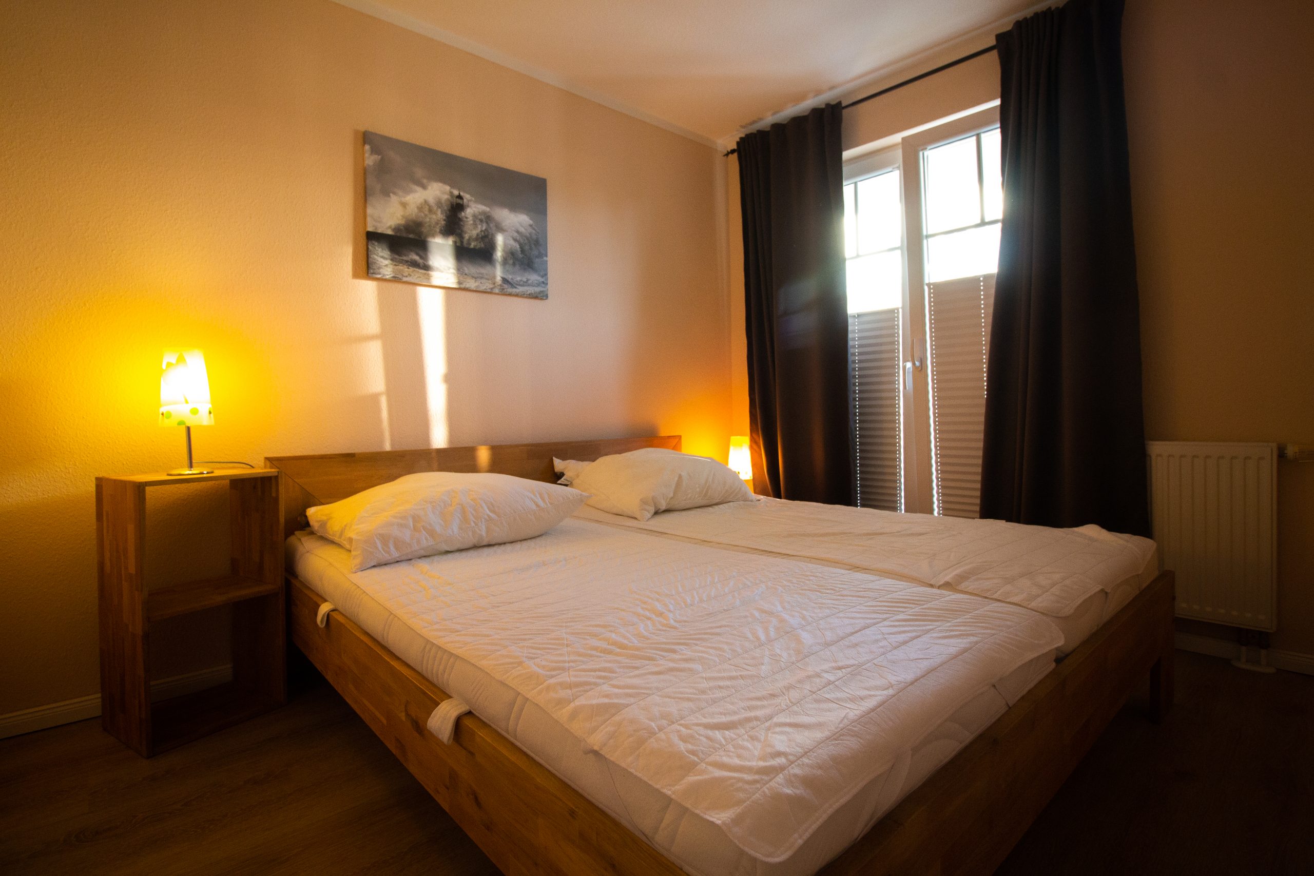 Das Schlafzimmer verfügt über ein großes Doppelbett. Ein großer Kleiderschrank befindet sich im Flur.